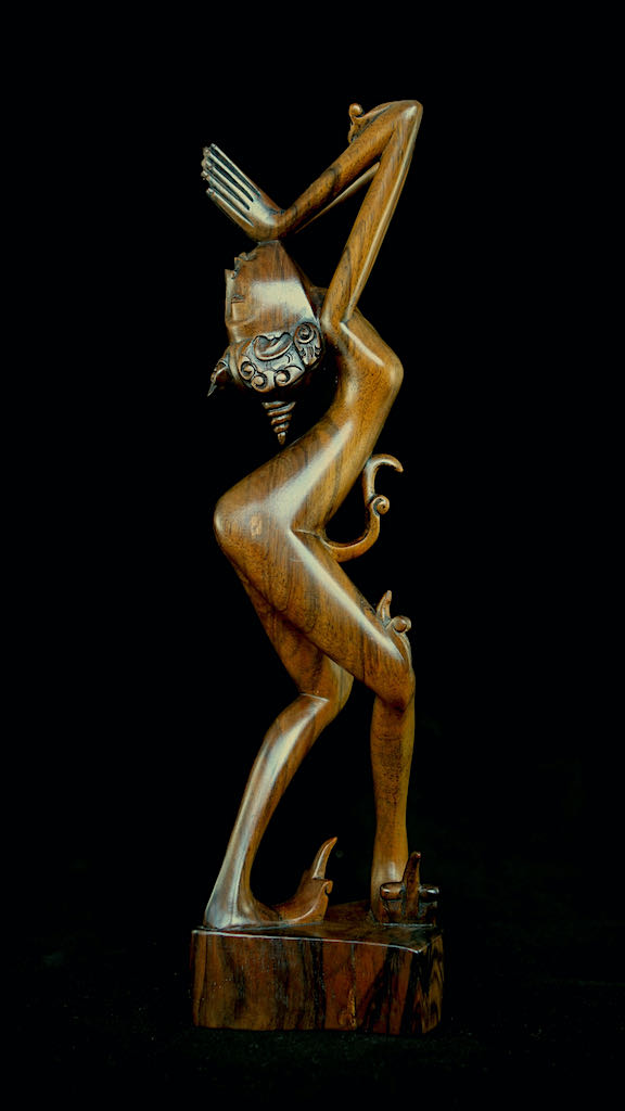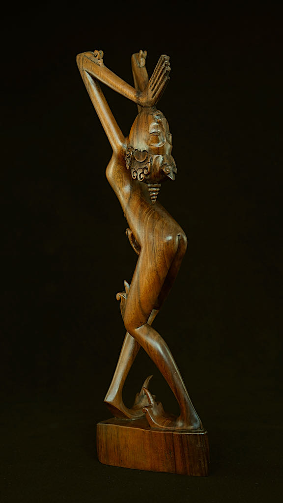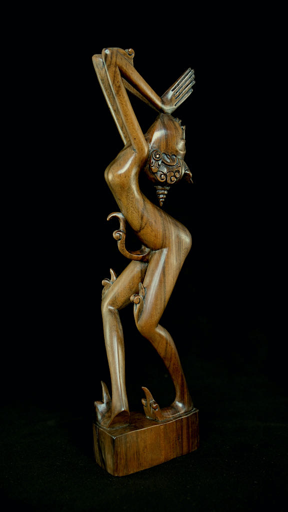 Acintya is the supreme divine principle in Balinese Hinduism and is also called Tintya (‘the inconceivable’, ‘the unimaginable’) or Sang Hyang Widhi Wasa (‘the divine order’) or Sang Hyang Tunggal (‘the divine oneness’). Characteristic of Acintya statues are the flame and phallus-shaped protrusions on his body. This refers to the fact that Acintya is also seen as a sun and fertility god. The elegant S-shape of his body is inspired by the Shiva-Natarajah dance form.