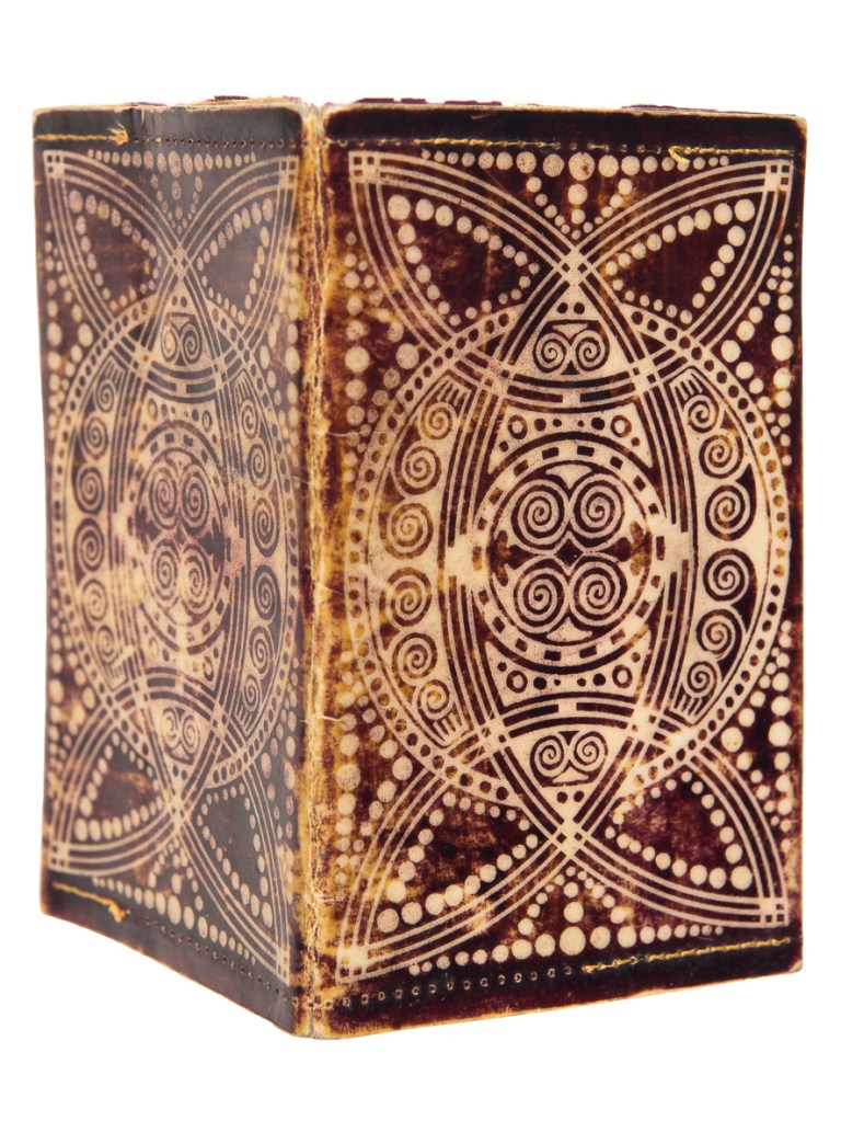 The small business card booklet shown above is made of parchment with a wine red batik decoration. It is made around 1905 by the Dutch designer Theo Neuhuys (1878-1921). The decoration with a pattern of circles, dots and spiral shapes is characteristic for the geometric variant of Dutch Art Nouveau.