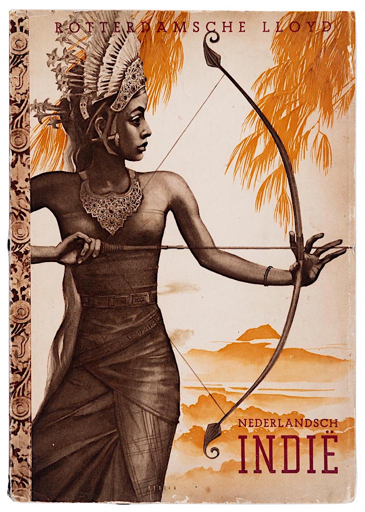 This is how the foreword to this comprehensive travel brochure for the Dutch East Indies begins. The text was written by the Dutch novelist Jo van Ammers-Küller, who also made a trip to the Dutch East Indies with the Rotterdam Lloyd herself. The folder was designed by the Dutch graphic artist Johann von Stein, who was known for his modern photo montages and slick art deco style. The travel brochure is filled with pictures of the people, nature and culture in the Indonesian archipelago. The printing and design with fold-out pages and silver print are state of the art. The cover shows a Balinese dancer with a bow and arrow.