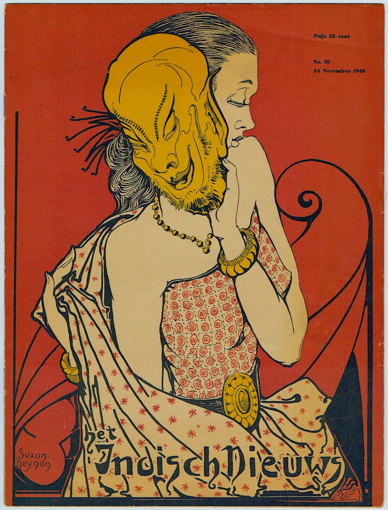 The cover of this edition (November 24, 1945) was designed by Dutch-Indies artist Suzon Beynon, who gave drawing lessons in Bandung. During World War II she moved to England, Australia and the USA. Beynon worked in a late Symbolist style. It’s a bit of a guess what she wanted to express with this color woodcut, but the woman on the cover probably personifies Indonesia. She’s depicted as a dancer or actress taking off her stage mask. The woman turns her head away as if she doesn’t dare look us in the eye.
