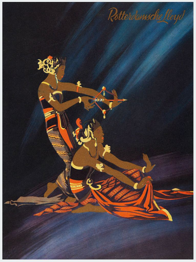 This beautiful menu card was published around 1940 by the Rotterdam Lloyd shipping company. The design for the menu is based on drawings by the Swedish author and artist Tyra Kleen (1874-1951), who made a series of illustrations of Javanese court dancers and Balinese temple dancers during her stay in the Dutch East Indies from 1919 to 1921. Kleen published books on Javanese and Balinese dance, wayang and the symbolic hand movements (mudra) of Balinese priests.
