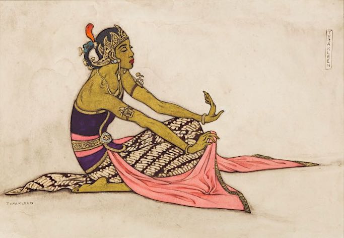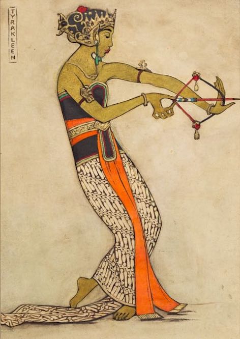 The upright dancer with bow and arrow is a bedhaya dancer. The depicted position is a version of bedhaya manah and represents a combat moment when the bow is tightened. The dance posture, but also details such as the headdress, clothes and position of the hands are clearly copied from Tyra Kleen’s watercolor.