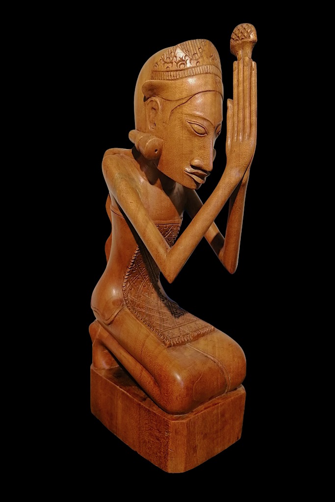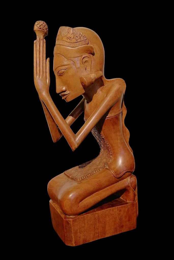 This beautiful wood carving represents a praying woman. She is depicted in the typical Balinese prayer position with both hands in front of her forehead and a flower between her fingertips. Sacrifice is an important activity in Bali. It starts early in the morning when women make small offerings in front of their homes to please the gods. This continues throughout the day. The prayer in the form of a flower greeting is called Sembahyang. This word consists of two parts: sembah (bow, prayer gesture) and hyang (the one who is revered). The prayer consists of a mantra and is directed to Sang Hyang Widhi Wasa, the supreme being in Balinese Hinduism.